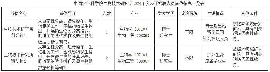 中國農業科學院生物技術研究所2024年度第二批公開招聘公告