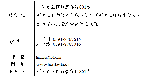 報名地點:焦作市碧蓮路801號河南工業和信息化職業學院(河南工程技術學校)圖書信息大樓八樓第三會議室現場報名。