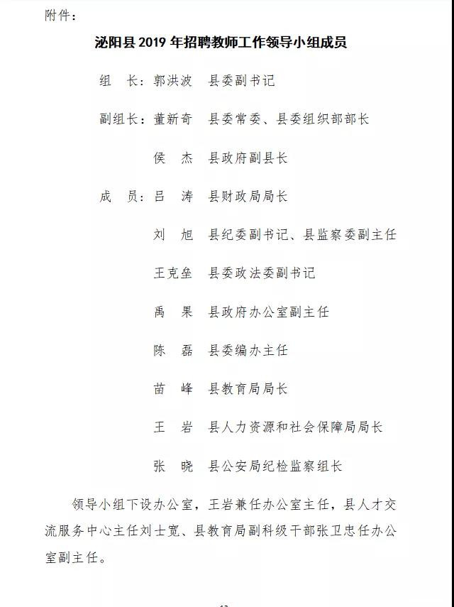 附件:1、泌陽縣2019年招聘教師工作領導小組成員