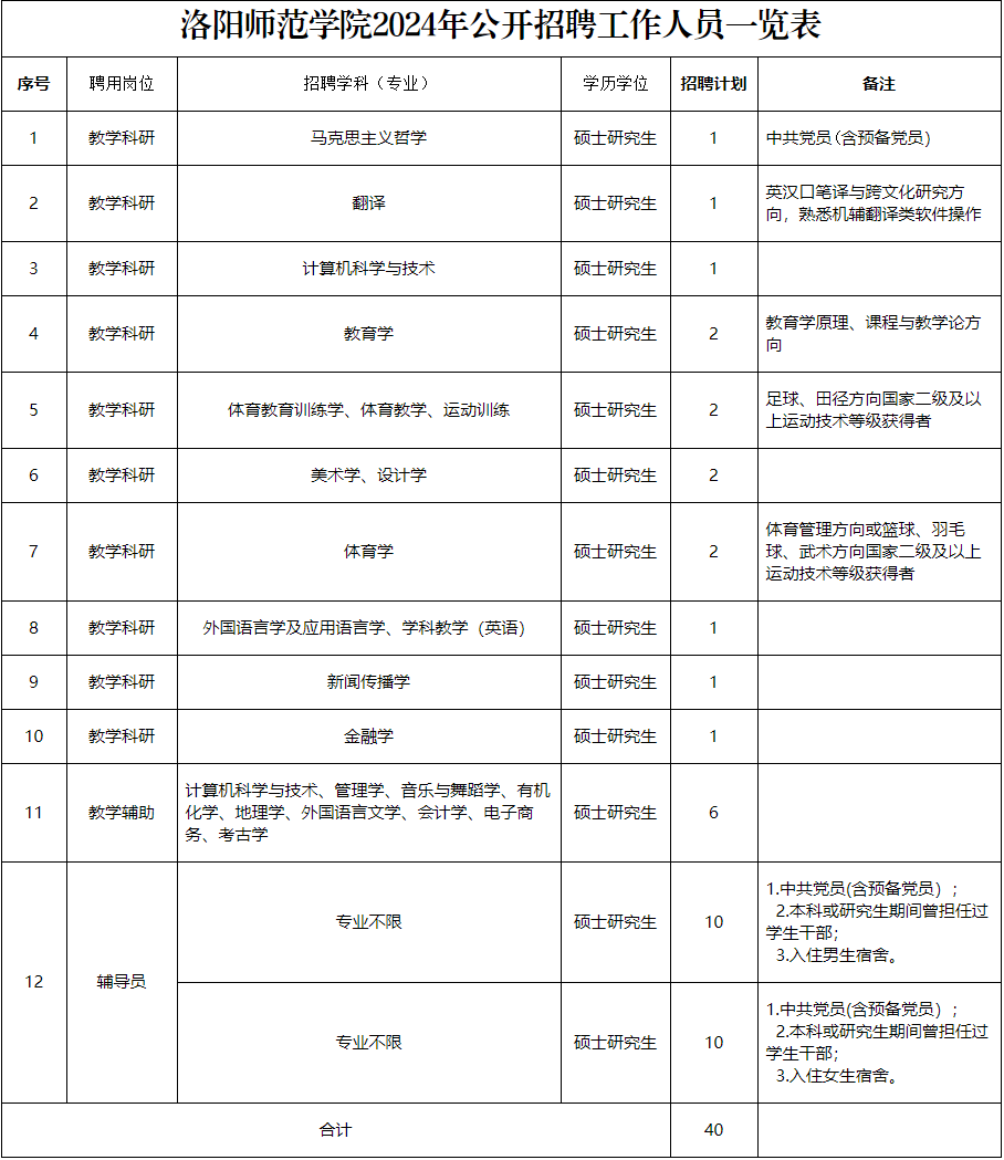 根據我校人員崗位空缺情況和發展需要,擬招聘40名工作人員。詳見附件《洛陽師范學院2024年公開招聘工作人員一覽表》。