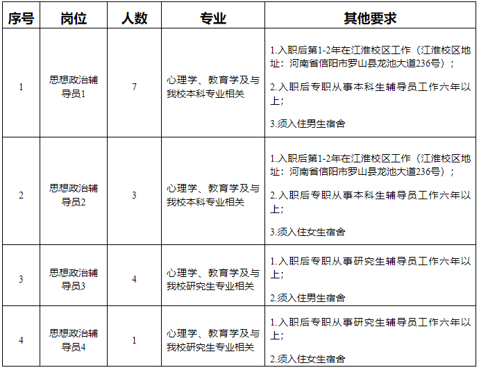 根據(jù)《河南省事業(yè)單位公開招聘工作規(guī)程》(豫人社〔2015〕55號)規(guī)定,我校擬面向社會公開招聘本科生專職輔導(dǎo)員10名、研究生專職輔導(dǎo)員5名。結(jié)合我校實(shí)際,制定本公開招聘方案。