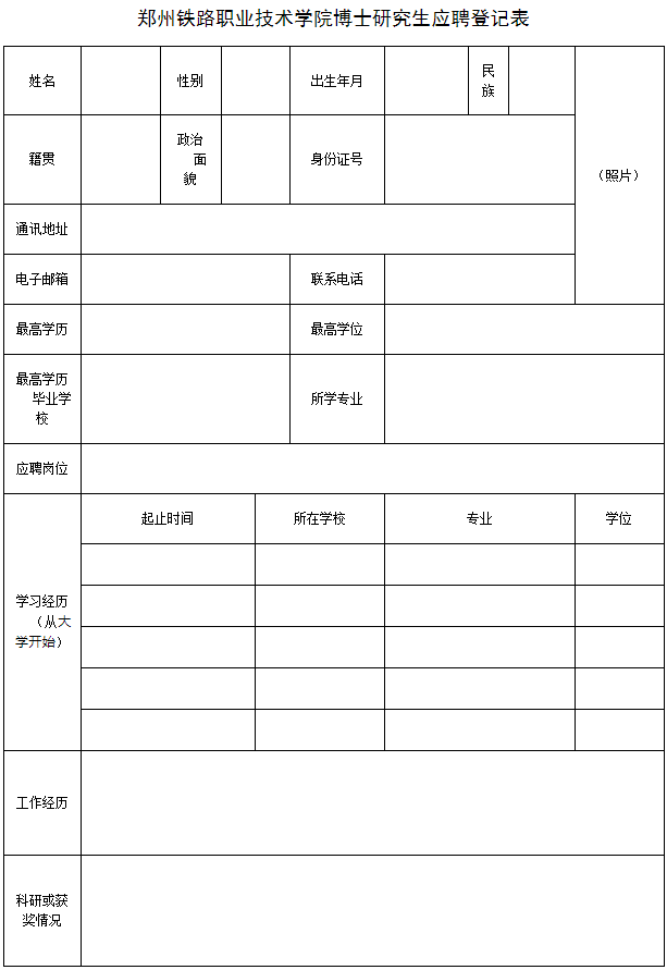 報名采用網上報名方式,請填寫《鄭州鐵路職業技術學院博士研究生應聘登記表》,并隨個人大學階段所有學歷、學位證書及認證報告等電子版材料發送至指定郵箱(zzrvtcrsc@126.com)。每人限報我校1個崗位,請應聘者慎重選報。