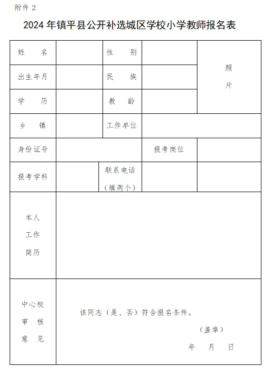 附件2:2024年鎮平縣公開補選城區學校小學教師報名表