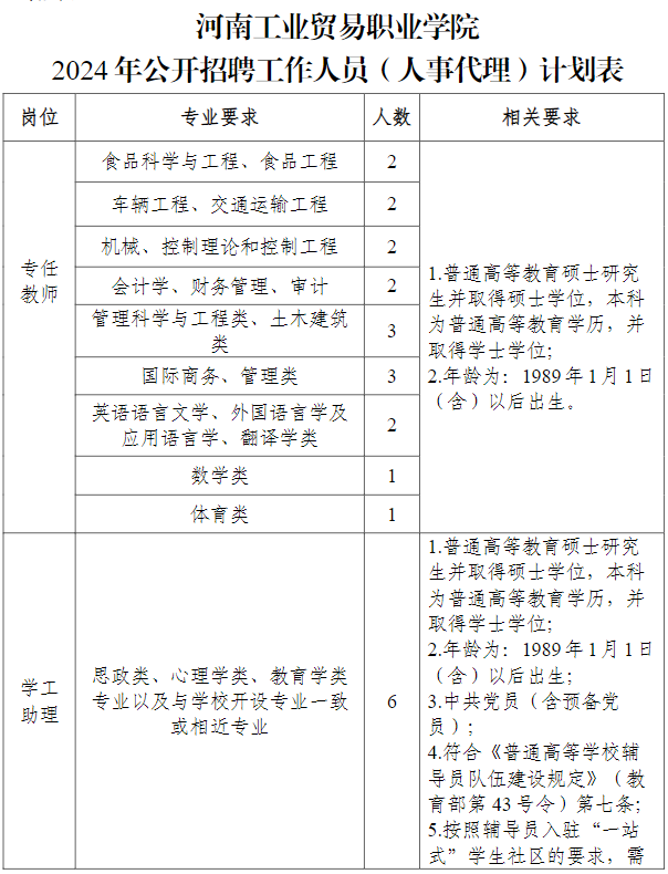 附表:1.河南工業貿易職業學院2024年公開招聘工作人員(人事代理)計劃表