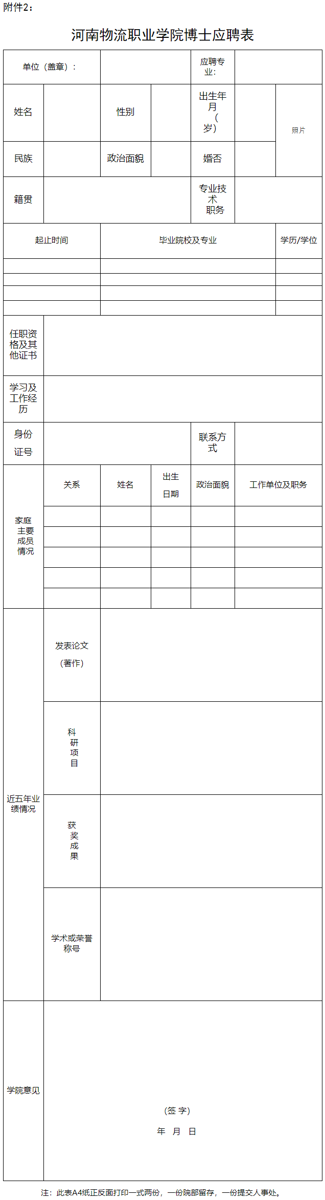 (1)河南物流職業學院博士應聘表登記表(見附件2);