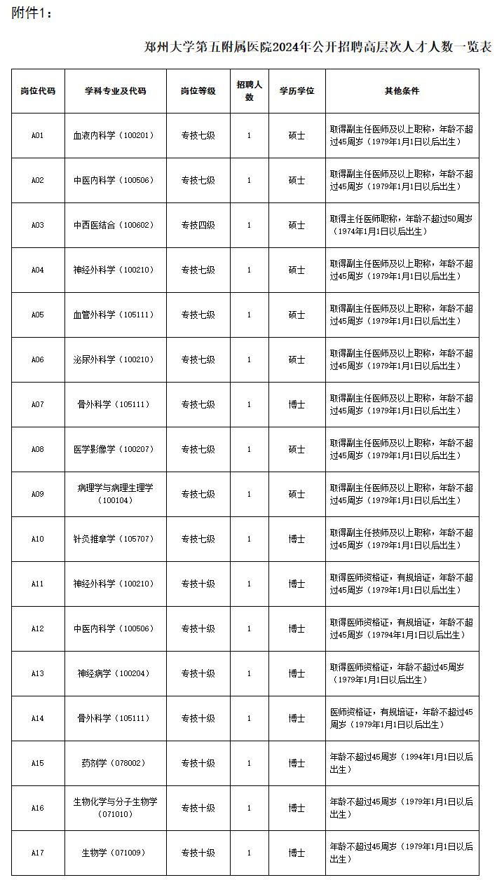 招聘人數共17名,具體崗位專業詳情見附表一:《鄭州大學第五附屬醫院2024年公開招聘高層次人才人數一覽表》。