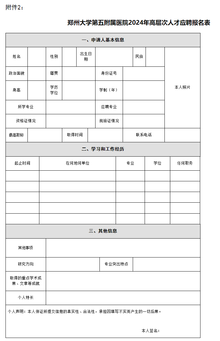 (2)《鄭州大學第五附屬醫院2024年應聘報名表》word版;