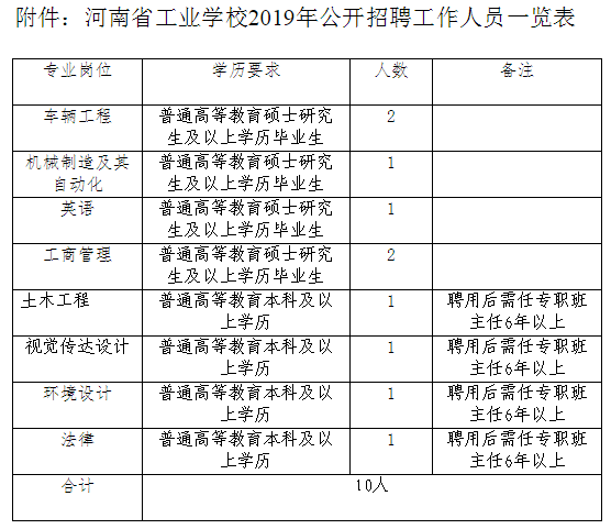 6.崗位所需的專業和其他條件(詳見附件《河南省工業學校2019年公開招聘工作人員一覽表》)。