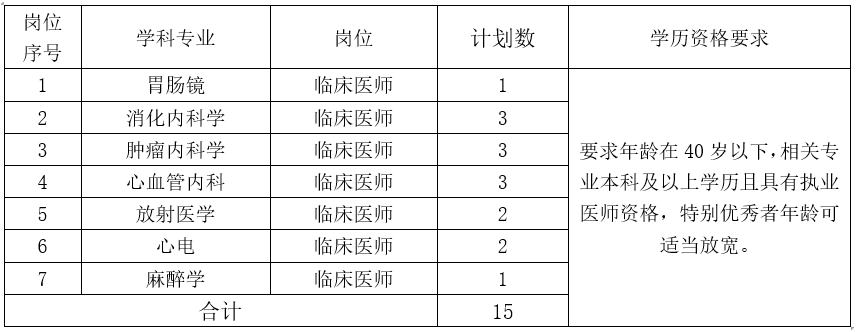4.臨床醫(yī)師要求年齡在40歲以下,相關(guān)專業(yè)本科及以上學(xué)歷且具有執(zhí)業(yè)醫(yī)師資格,特別優(yōu)秀者年齡可適當(dāng)放寬; 2020年及以后畢業(yè)的全日制本科生及以上學(xué)歷人員,應(yīng)取得規(guī)培合格證或在規(guī)培期間內(nèi)。其中副高級(jí)職稱要求45歲以下,正高級(jí)職稱要求50歲以下,高級(jí)職稱人員可視情況辦理編制手續(xù)。