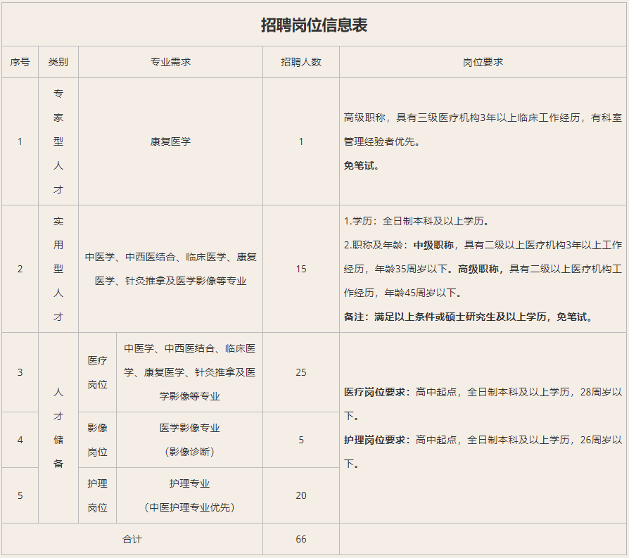 為進一步加強人才隊伍建設,滿足醫院業務發展需要,特面向社會公開招聘醫療和護理等專業技術人員66名。具體明細如下(詳見附件):