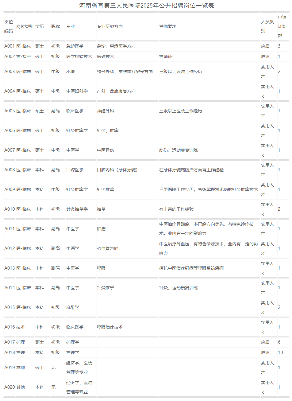 崗位、專業(yè)及其他條件詳見《河南省直第三人民醫(yī)院2025年公開招聘崗位一覽表》(附件1)。