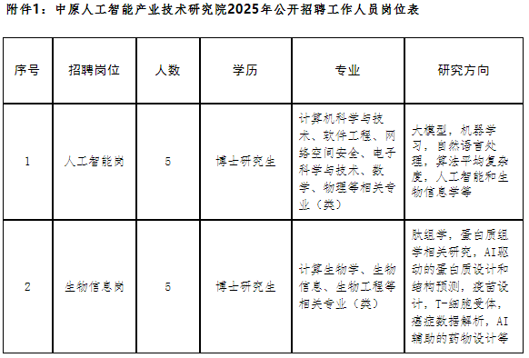 招聘崗位、專業及要求詳見《中原人工智能產業技術研究院2025年公開招聘科研人員計劃表》(附件1)。
