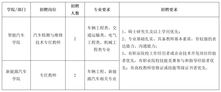 鄭州汽車工程職業學院是經河南省人民政府批準、教育部備案的一所普通高等職業院校。學校位于河南省省會鄭州市,毗鄰鄭州汽車產業園,交通發達,區域位置優越獨特,校園文化氣息濃厚,環境優雅,溫馨宜人,是莘莘學子學習、生活的理想場所。學校立足鄭州,面向河南,輻射全國。依托汽車制造產業,形成以汽車制造與汽車服務類專業為主體,以電子信息技術類、裝備制造類、電商物流類、文化藝術類專業為支撐的框架結構;培養動手能力強、綜合素質高、具有創新精神的技術技能型人才。 學校辦學特色明顯,專業優勢突出,是河南省第一所建在產業園區的汽車類高等職業院校,把課堂搬到了工廠車間和生產一線,真正實現了“前廠后校”“校中廠、廠中校”的辦學模式。所有專業都圍繞汽車產業開設,現設有新能源汽車學院、智能汽車學院、智能制造學院、電子信息工程學院、電商物流學院、數字藝術與設計學院、通識教育學院、公共藝術教育中心、馬克思主義學院等二級學院;開設有汽車類、計算機類、道路運輸類、電子商務類、物流類、藝術設計類、廣播電視類等二十余個專業,每個專業都高度契合河南省汽車及裝備制造等產業發展需求。 現面向社會誠聘管理干部及專業教師,期待大家的加入!希望未來能與大家攜手進步,共同發展,實現學校和個人“雙贏”發展目標。 二、招聘對象基本條件 1、具有中華人民共和國國籍,擁護中國共產黨的領導,以習近平新時代中國特色社會主義思想為指導,熱愛教育事業; 2、遵守憲法和法律;具有良好的品行,具有較強的敬業精神和團隊協作精神,樂于奉獻; 3、身心健康,具有正常履行職責的身體條件; 4、具有崗位所需要的專業和技能條件,具有科研創新能力,統招碩士研究生及以上學歷(特別優秀的可以放寬到統招本科、非統招碩士研究生);相應崗位需具有高校教師資格證書(具體要求以《招聘崗位及具體要求》為準); 5、教師崗位原則上年齡在40周歲以下;副高以上職稱人員原則上年齡不超過55歲(特別優秀的可適度放寬); 6、同等條件下,具有高校教師資格證書者優先;專業崗位具有對應崗位工作經驗者優先;管理干部崗位具有副高以上職稱及對應崗位工作經驗者優先。 三、聘用及福利待遇 1、按國家相關規定簽訂正式勞動合同,入職繳納五險一金; 2、高層次人才福利待遇一人一議,其他行政崗及教師崗待遇從優,執行學校薪酬標準; 3、享受國家法定的節假日及帶薪寒暑假,并享有節日福利、兼職津貼、年度績效考核獎; 4、符合條件者,提供宿舍,配備空調、熱水器等基本生活設施; 5、教職工餐廳提供用餐,學校給予餐補; 6、提供教師進修培訓機會; 7、引進的人才在享受學校相關待遇的同時若符合“智匯鄭州”人才工程的補助條件,則可享受每月1000-1500元的生活補貼及5-10萬元的購房補貼。 四、招聘崗位及具體要求 高層次人才崗 行政管理崗 二級學院教師崗 五、簡歷投遞