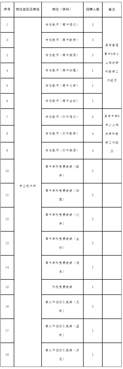 3.報考專任教師崗位要求應聘者年齡40周歲以下(1984年11月以后出生),具有中小學正高級職稱或被評為河南省特級教師(或省外相當榮譽)的年齡50周歲以下(1974年11月以后出生)。具有中學相應學段6年以上相關學科教學工作經歷,且具備下列條件之一:獲得過省級教育部門或聯合其他部門舉辦的優質課比賽、班主任基本功大賽等業務評比活動一等獎(含)以上,或具有中小學正高級職稱,或被評為河南省特級教師(或省外相當榮譽)。