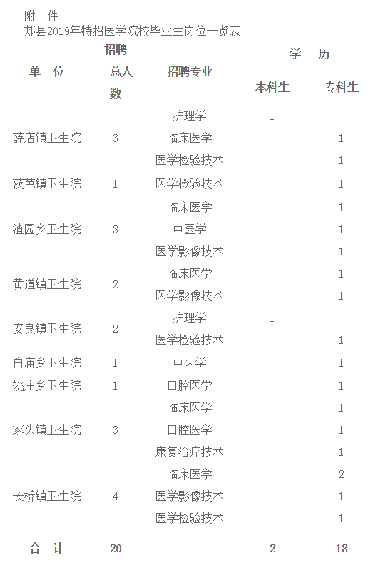 特招醫學院校畢業生20名,其中鄉鎮衛生院招聘本科生2名、專科生18名。