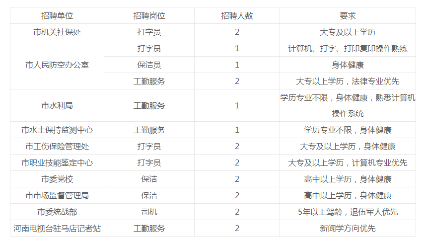 為了貫徹落實就業援助政策,有效促進就業困難人員就業,依據《河南省就業促進條例》、《河南省公益性崗位暫行管理辦法》和《駐馬店市公益性崗位暫行管理辦法》的有關規定,本著“公開、公平、公正”的原則,現面向社會公開招聘公益性崗位人員20名,現將招聘有關事項公告如下: