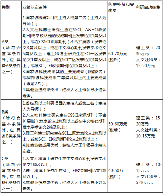 (5)特別優秀博士研究生:按照A、B、C類業績分類,業績特別優秀且超越業績條件者,具體根據情況一事一議。