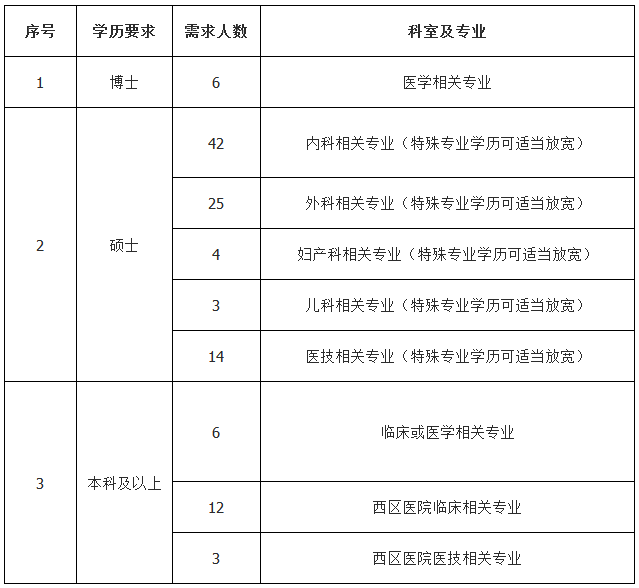 西區醫院15人:醫學專業本科12人,醫技專業本科3人。