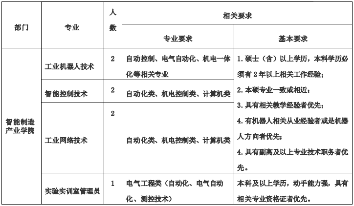 一、學院簡介2019 年河南水利與環境職業學院與河南水滴智能技術有限公司聯合成立混合所有制二級學院智能制造產業學院。學院目前開設有工業機器人技術、智能控制技術、工業網絡技術等專業,其中工業機器人技術專業設裝配與調試工程師、系統集成工程師兩個方向。在校生 近 600 人。因工作需要,根據學院招聘的有關規定,智能制造產業學院面向社會公開招聘教師,有關事項公告如下。