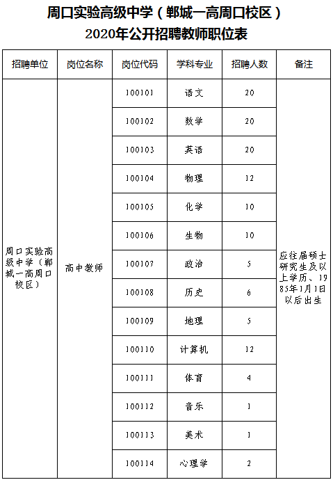 根據(jù)周口實(shí)驗(yàn)高級(jí)中學(xué)(鄲城一高周口校區(qū))編制核定和教學(xué)需求,2020年面向應(yīng)往屆畢業(yè)生公開招聘一批教師,納入周口市財(cái)政編制。