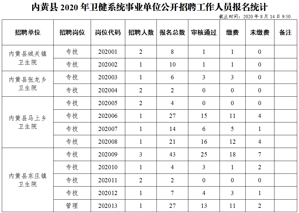 內黃縣2020年衛健系統事業單位公開招聘工作人員報名統計(2020年8月14日9:50)