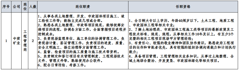 滎陽市城市投資開發有限責任公司為滎陽市國有獨資公司,承擔城市綜合開發、運營等職能。鄭州中滎礦業有限公司是滎陽市城市投資開發有限責任公司的全資子公司,現面向社會公開招聘,招聘崗位及要求如下: