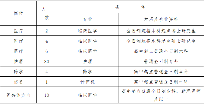 醫(yī)療、醫(yī)技、護理、藥學、信息等,具體招聘崗位、條件及人數(shù)詳見下表: