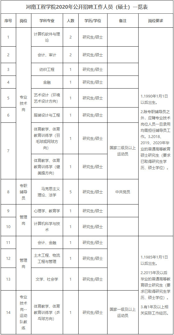 附件:河南工程學院2020年公開招聘工作人員(碩士)一覽表