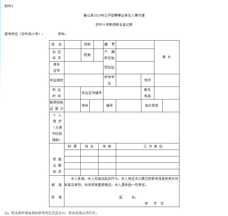 2.2019年魯山縣公開招聘事業單位初中小學教師報名表.