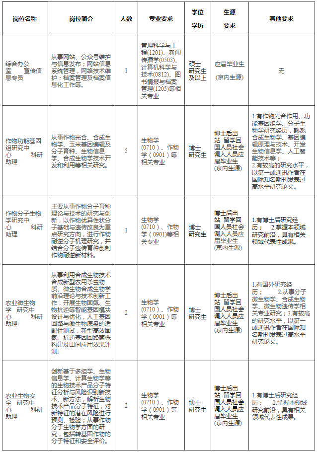 中國農業科學院生物技術研究所2021年度公開招聘人員崗位信息一覽表