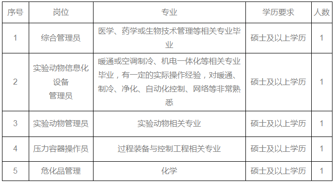 5.年齡不超過35歲(1986年3月16日及以后出生),實驗動物信息化設備管理員、實驗動物管理員和壓力容器操作員崗位有相關工作經驗者,可適當放寬至40歲(1981年3月16日及以后出生);