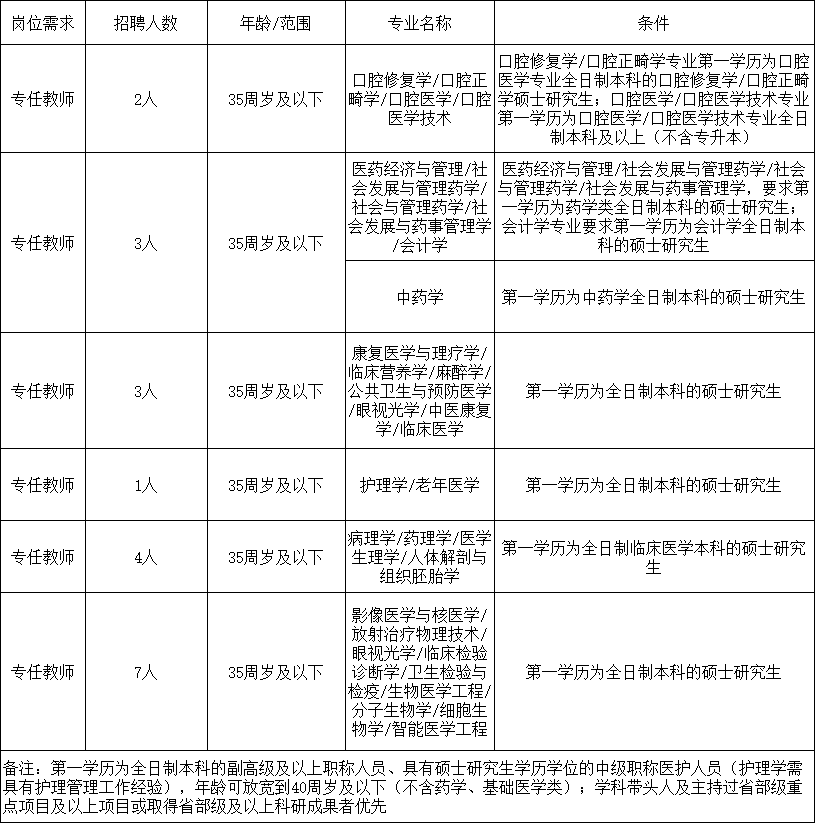 3.應聘人員需為全日制碩士研究生畢業,第一學歷為全日制本科;副高級職稱學歷放寬至全日制本科。碩士研究生年齡在35周歲及以下,第一學歷為全日制本科的副高級及以上職稱人員、具有碩士研究生學歷學位的中級職稱醫護人員(護理學需具有護理管理工作經驗),年齡可放寬到40周歲及以下(不含藥學、基礎醫學類);學科帶頭人及主持過省部級重點項目及以上項目或取得省部級及以上科研成果者優先。第一學歷為全日制本科畢業生可以應聘急需緊缺崗位。