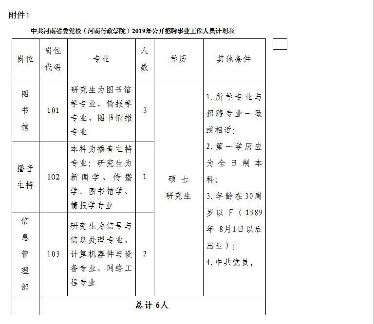 圖書館、信息管理部工作崗位招聘6名碩士研究生(見附件1《中共河南省委黨校(河南行政學院)2019年公開招聘事業工作人員計劃表》)。
