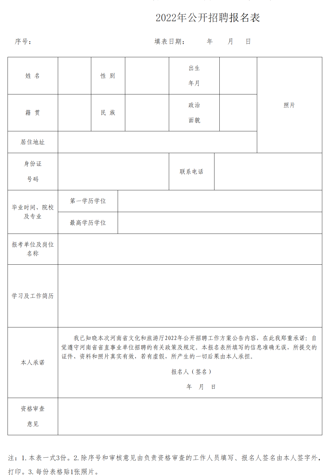 報考人員需在河南省文化和旅游廳網站、河南省人事人才考試測評服務中心、招聘事業單位網站自行下載填寫并打印《河南省文化和旅游廳直屬事業單位2022年公開招聘報名表》(見附件2)一式3份,在面試資格確認時現場提交。