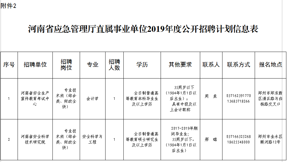 招聘崗位及人數(shù):公開招聘專業(yè)技術(shù)人員共2名,崗位具體要求詳見《河南省應(yīng)急管理廳直屬事業(yè)單位2019年公開招聘崗位信息表》。