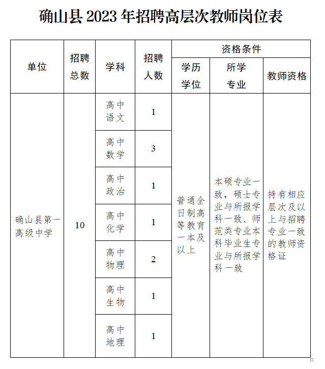 (一)招聘計劃。計劃招聘確山縣第一高級中學教師10名。