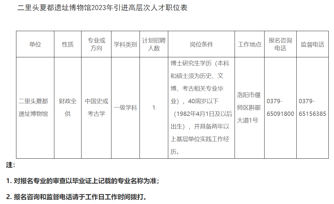 洛陽市二里頭夏都遺址博物館2023年引進高層次人才