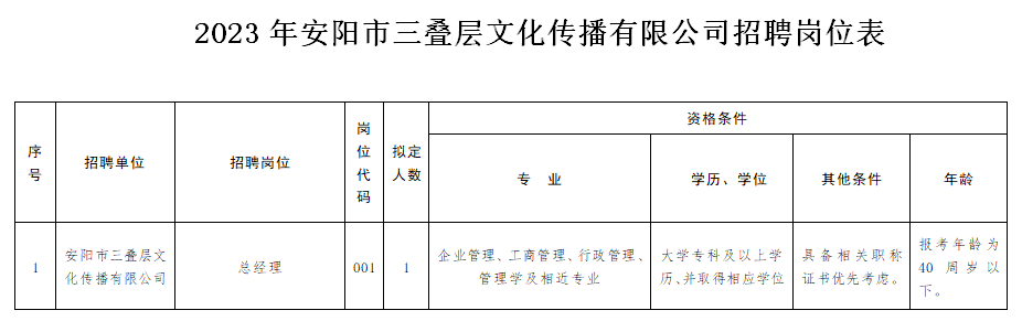 安陽市三疊層文化傳播有限公司總經理一名(詳情見附件1)。