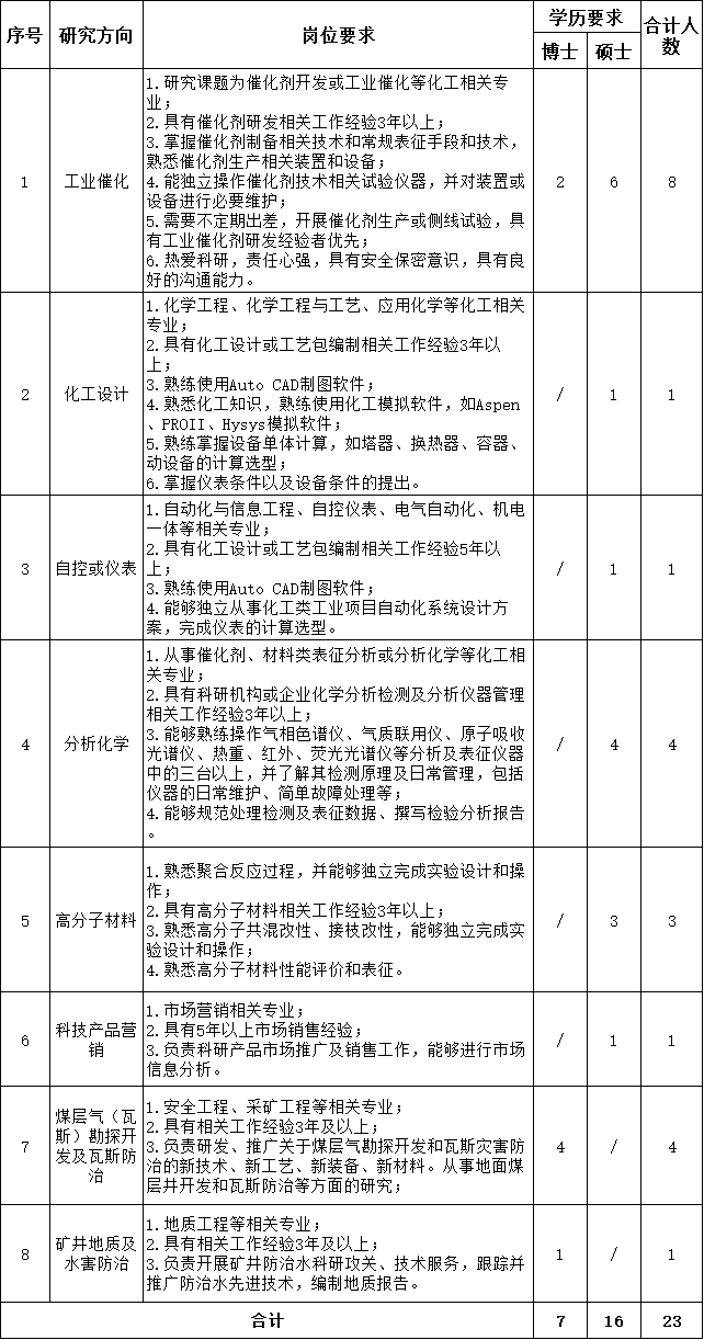 三、應聘條件 1.熱愛祖國,擁護中國共產黨的領導,遵紀守法;勤奮踏實,吃苦耐勞,為人正派,責任心強,具有強烈的進取精神和良好的團隊合作精神; 2.認可河南能源企業文化,符合招聘崗位的任職要求; 3.熱愛科研工作,具有扎實的理論基礎和專業知識、較強的科研能力,有相關實際工作和科研經驗者優先; 4.統招全日制碩士及以上學歷,45周歲及以下(1978年6月1日之后出生),條件特別優秀者可適當放寬; 5.身心健康,體檢合格。