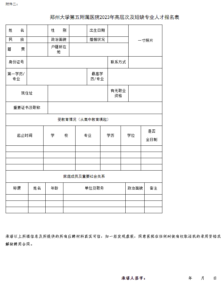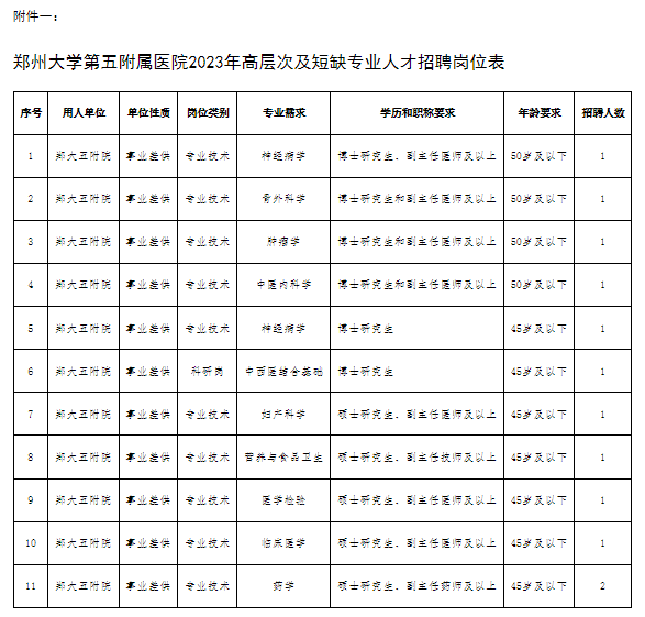具體數量、范圍、對象、條件見附件一《鄭州大學第五附屬醫院2023年招聘高層次及短缺專業人才崗位表》。
