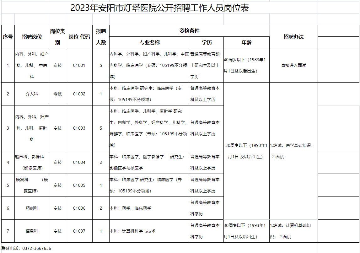 具體招聘崗位、人數(shù)、資格條件和招聘辦法詳見《2023年安陽(yáng)市燈塔醫(yī)院公開招聘工作人員崗位表》(附件1)。
