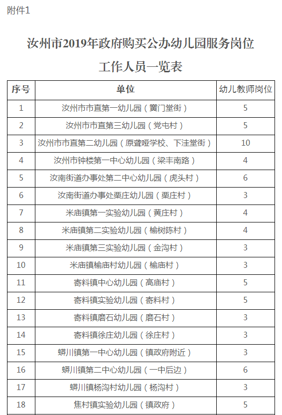 附件:1.汝州市2019年公開招聘政府購買幼兒園服務崗位工作人員崗位設置一覽表