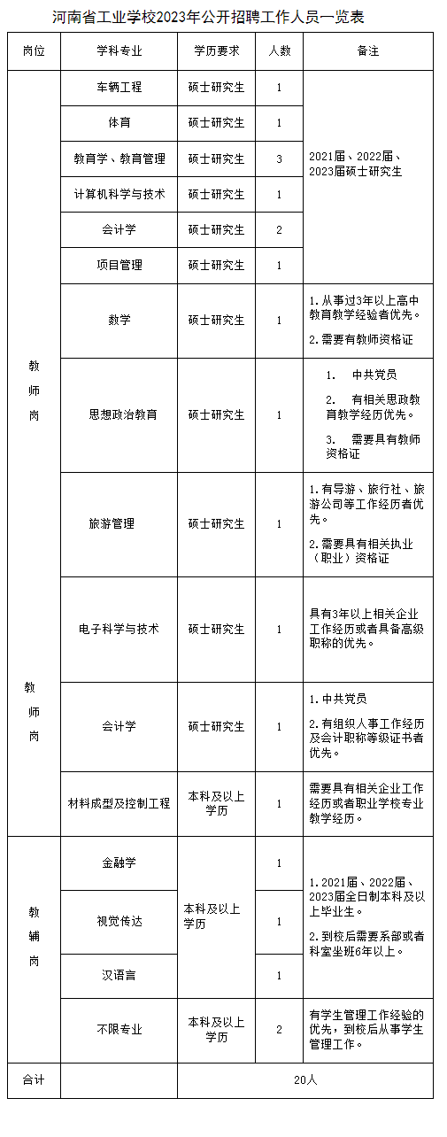 6.崗位所需的學(xué)歷、專業(yè)和其他條件(詳見附件《河南省工業(yè)學(xué)校2023年公開招聘工作人員一覽表》);