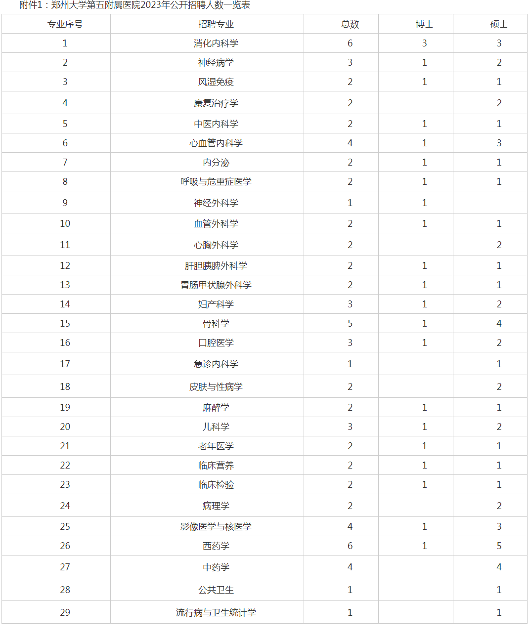 詳情見附表一:《鄭州大學第五附屬醫院2023年公開招聘人數一覽表》 。