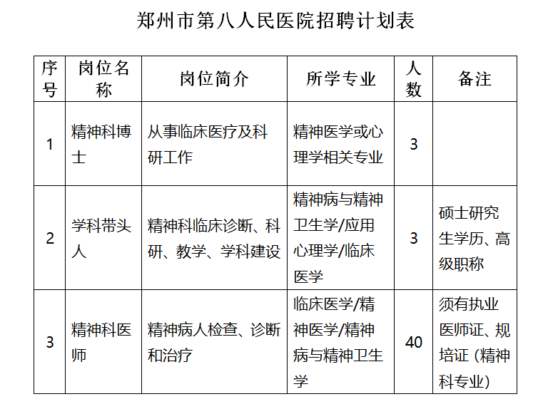 有意者請(qǐng)登陸鄭州市第八人民醫(yī)院官方網(wǎng)站(http://www.zz8y.com),點(diǎn)擊“醫(yī)院動(dòng)態(tài)”→“人才招聘”→下載附件填寫《鄭州市第八人民醫(yī)院公開招聘人員報(bào)名簡表》和《鄭州市第八人民醫(yī)院公開招聘人員報(bào)名表》(郵件的主題、附件名稱統(tǒng)一使用以下格式:姓名-專業(yè)-學(xué)歷)。身份證、學(xué)歷學(xué)位證書(提交學(xué)歷認(rèn)證報(bào)告或《教育部學(xué)歷認(rèn)證電子注冊(cè)備案表》)、規(guī)培證、執(zhí)業(yè)醫(yī)師資格證、專業(yè)技術(shù)資格證書、論文及科研成果獎(jiǎng)勵(lì)等相關(guān)資料的掃描或高清照片,發(fā)送至郵箱zzsdbrmyyzp@163.com;或攜帶以上材料到醫(yī)院人事科報(bào)名(二七區(qū)瑞民街5號(hào)辦公樓一樓人事科)。報(bào)名截止時(shí)間為2024年3月31日。