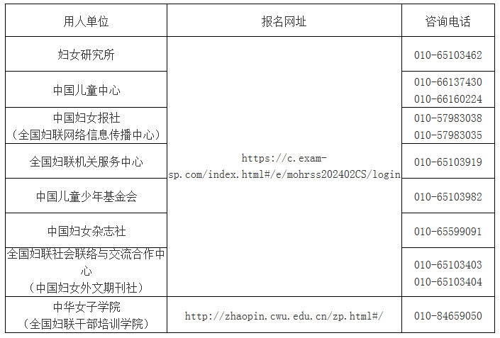 具體崗位及資格條件詳見《全國婦聯所屬在京事業單位2024年度公開招聘應屆高校畢業生崗位信息表》和《全國婦聯所屬在京事業單位2024年度公開招聘社會工作人員和留學人員崗位信息表》。