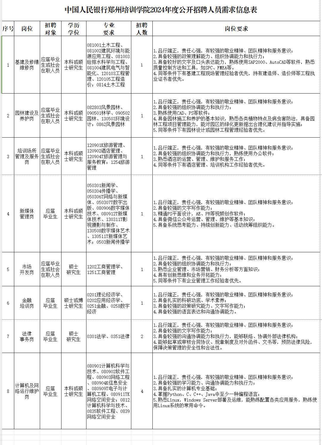 招聘崗位及要求詳見附件《中國人民銀行鄭州培訓學院2024年度公開招聘人員需求信息表》。工作地點在鄭州。