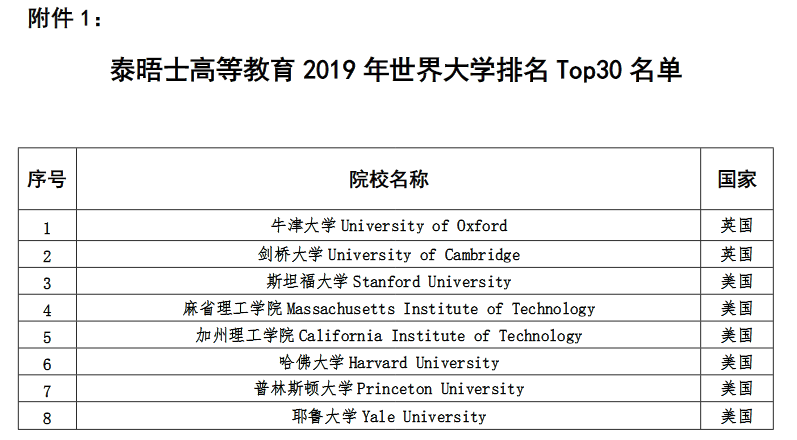 附件:1.泰晤士高等教育2019年世界大學排名Top30名單