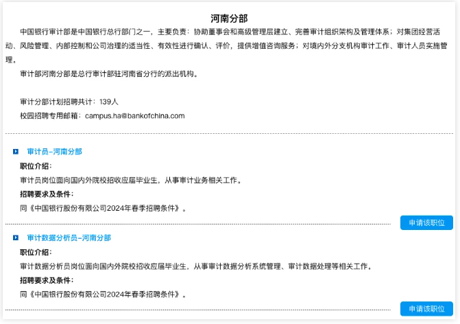 194人!中國(guó)銀行河南分行、河南審計(jì)分部招聘公告【至4.8】
