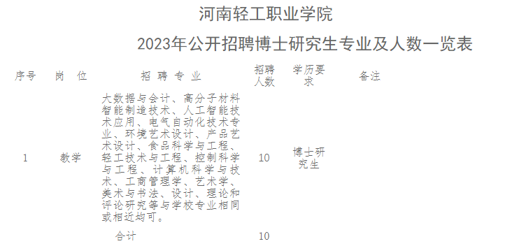 根據學校發展需要,擬招聘博士研究生10名。詳見附件《河南輕工職業學院2023年公開招聘博士研究生專業及人數一覽表》。